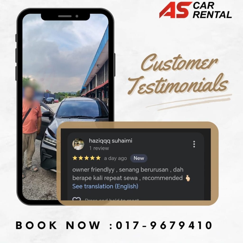 Terima kasih kepada Encik Haziqq Suhaimi atas review 5⭐ dan sokongan berulang kepada AS Car Rental.