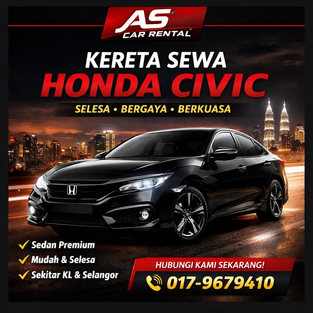 AS Car Rental menyediakan Honda Civic untuk disewa bagi kegunaan harian, perjalanan kerja, bercuti atau menghadiri majlis penting.