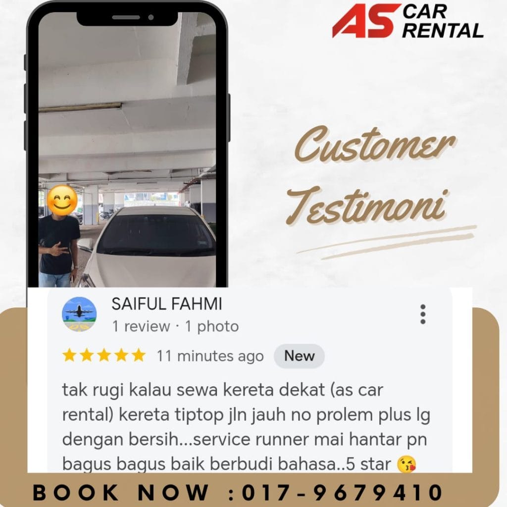 “Tak rugi kalau sewa kereta dekat AS Car Rental. Kereta tiptop, jalan jauh pun tiada masalah dan sangat bersih. Service runner yang datang hantar kereta juga sangat baik dan berbudi bahasa. Memang 5 star!”