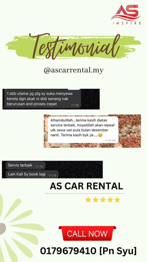Assalamualaikum, AS CAR RENTAL ingin mengucapkan terima kasih atas semua customer kami yang pernah menggunakan servis kereta sewa kami Disini saya sertakan testimoni customer yang menggunakan kereta sewa kami dan berpuas hati dengan servis yang terbaik dan sikap friendly team yang as car rental ada Untuk mengetahui lebih lanjut boleh terus berhubungi team kami 👇👇👇 […]